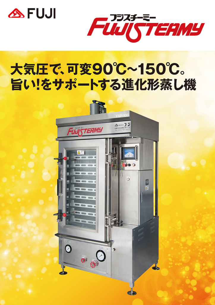 フジスチーミーFSPシリーズは、大気圧で、可変 90℃~150℃ 全自動コントロールで旨い!をサポートする進化型蒸し機